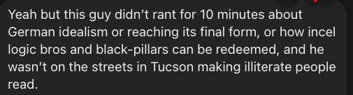 Selling and mythologizing yourself is a stage of transformation that many people are not at yet, but writers need to be. Appealing to people who don’t normally read is a great obstacle but could be a very fun challenge. Yet trying to be a piece of that collective transformation takes more work and flexibility, so it’s understandable why most find it easier to just write for similar nerds with similar interests. Hence, the Substack circle jerking. Which has been very noticeable.